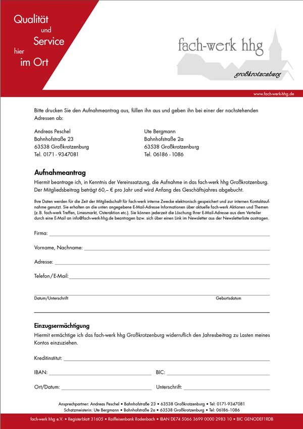 Hier können Sie sich einen Mitgliedsantrag herunterladen, ihn ausdrucken und bei Andreas Peschel (Appelsche, Bahnhofstraße 23) abgeben oder per E-Mail senden an mitglied@fach-werk-hhg.de.